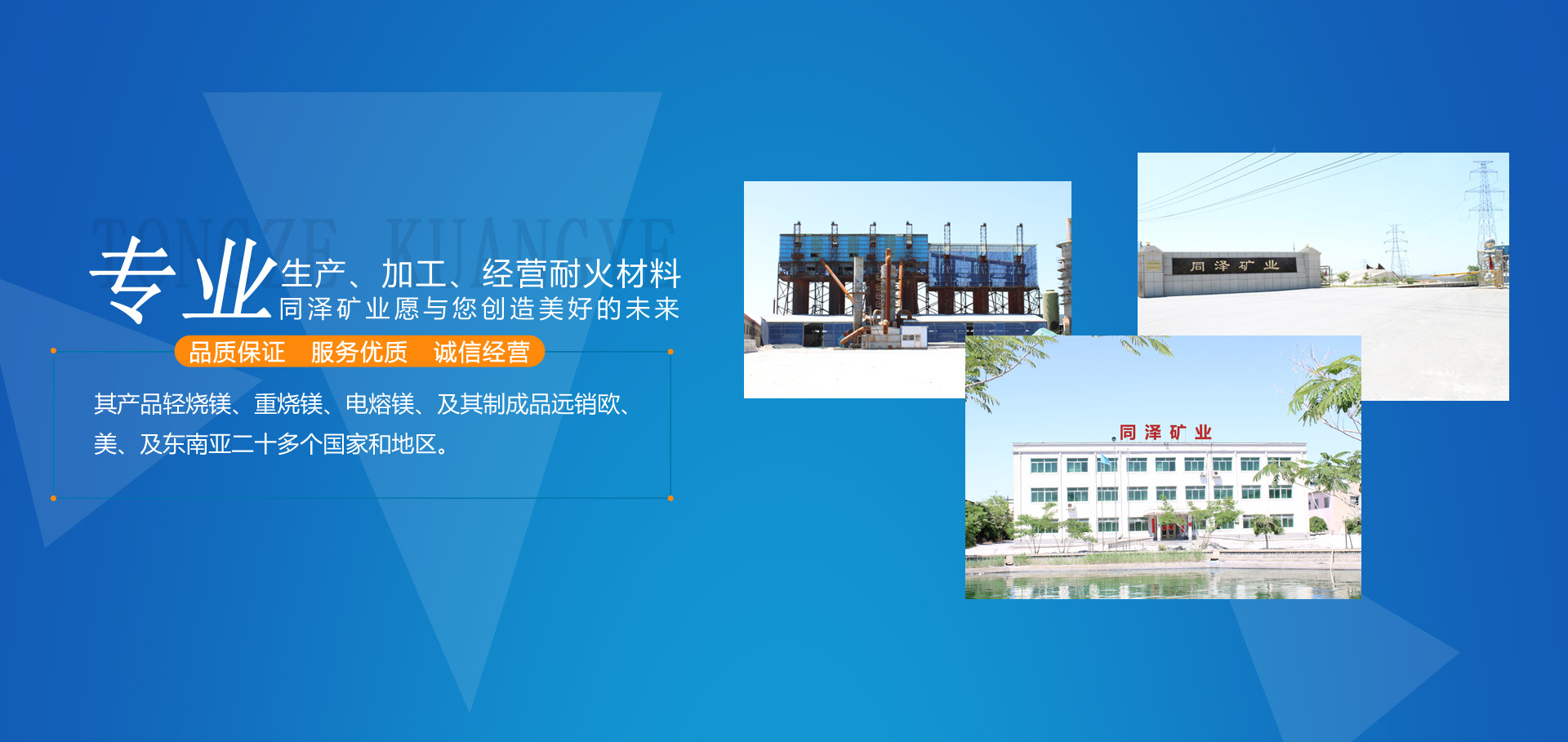 大石橋市同澤礦業(yè)有限公司,是以生產(chǎn)、加工、經(jīng)營各種耐火材料為主的綜合性經(jīng)濟(jì)實(shí)體。其產(chǎn)品輕燒鎂、重?zé)V、電熔鎂、及其制成品遠(yuǎn)銷歐、美、及東南亞二十多個國家和地區(qū)。